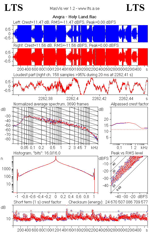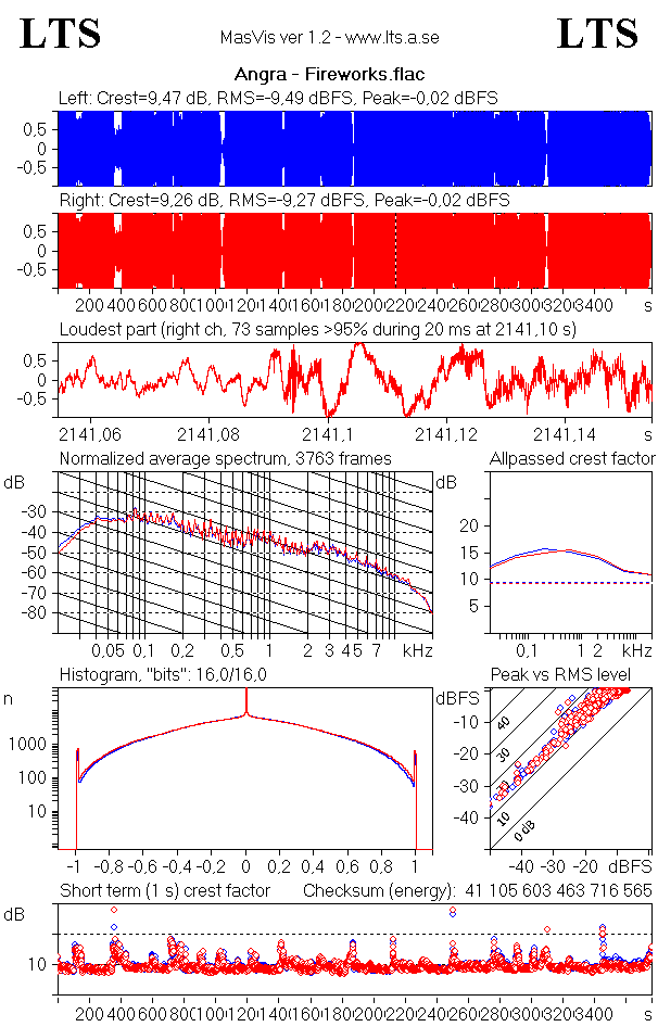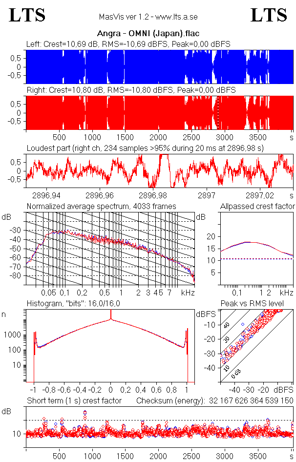 Общее Полное имя : \Angra\2006 - Aurora Consurgens\04. Breaking Ties.flac Формат : FLAC Формат/Информация : Free Lossless Audio Codec Размер файла : 24,8 Мбайт Продолжительность : 3 мин. 29 с. Режим общего битрейта : Переменный Общий битрейт : 990 Кбит/сек Альбом : Aurora Consurgens Имя трека : Breaking Ties Имя трека/Расположение : 04 Имя трека/Всего : 11 Исполнитель : Angra Издатель : Victor – VICP-63615 Жанр : Power Metal Дата записи : 2006 Обложка : Yes Описание обложки : cover.jpg (1400x1400) Тип обложки : Cover (front) MIME-тип обложки : image/jpeg Примечание : [declipped & DR-increased version] Аудио Формат : FLAC Формат/Информация : Free Lossless Audio Codec Продолжительность : 3 мин. 29 с. Вид битрейта : Переменный Битрейт : 964 Кбит/сек Канал(-ы) : 2 канала Расположение каналов : L R Частота дискретизации : 44,1 КГц Битовая глубина : 16 бит Метод сжатия : Без потерь Размер потока : 24,1 Мбайт (97%) Библиотека кодирования : CUETools FLACCL 2.2.5 MD5 незакодированного содержимого : 014E935C8E0077DA65ACDF8FF4531105