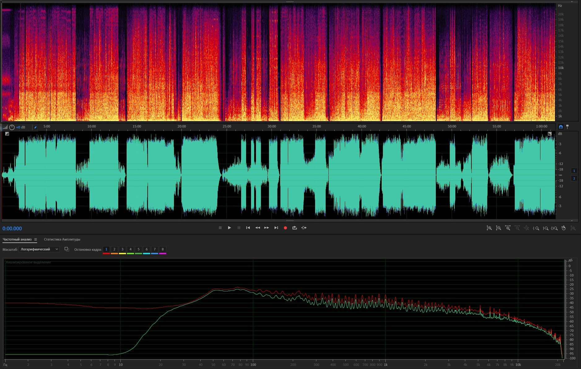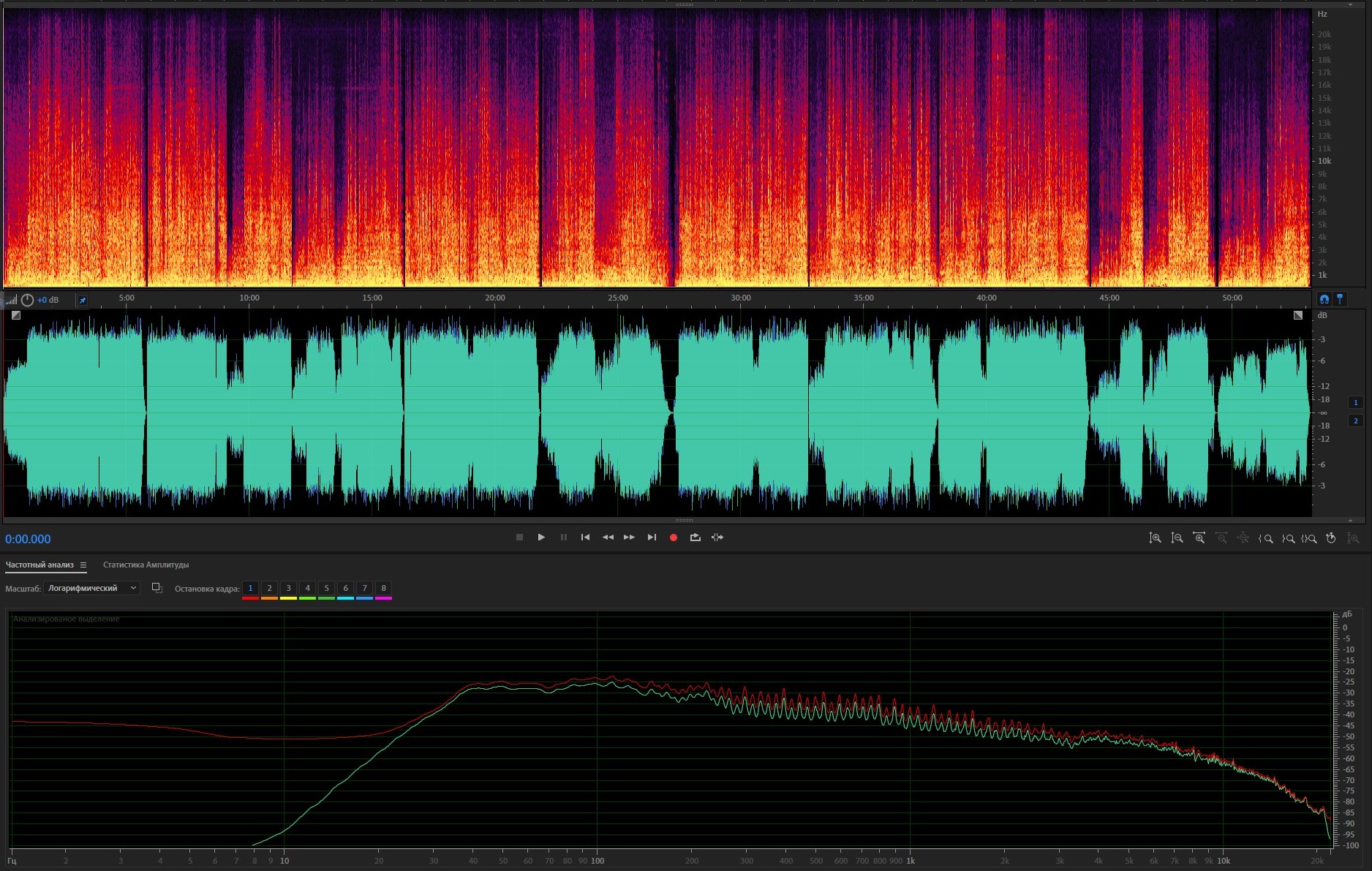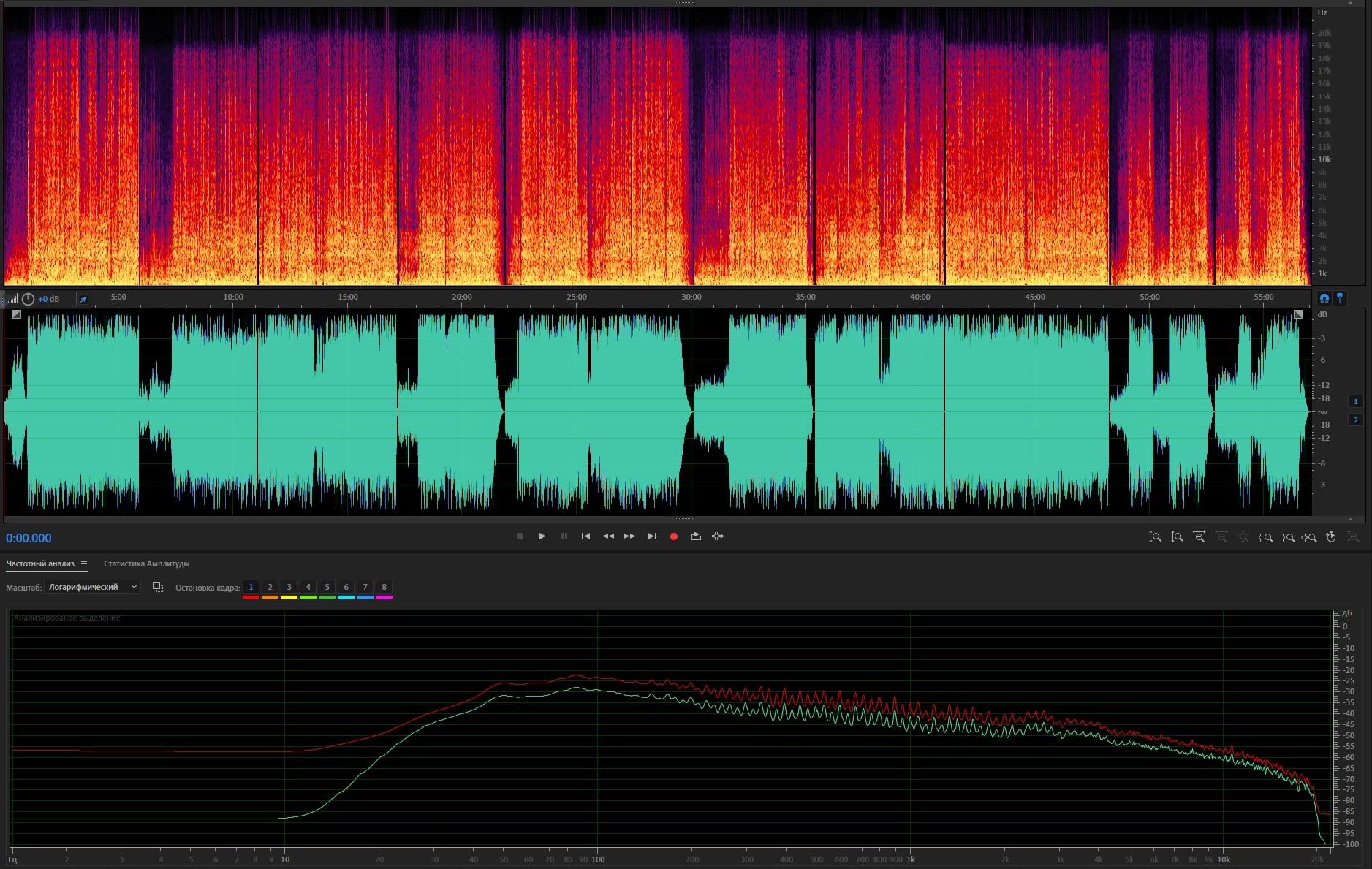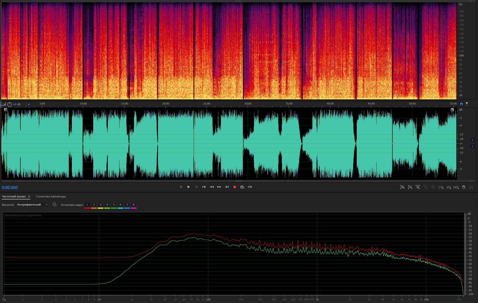 3. Спектр и амплитуда после обработки; АЧХ: красная - оригинал, зеленая - после обработки.