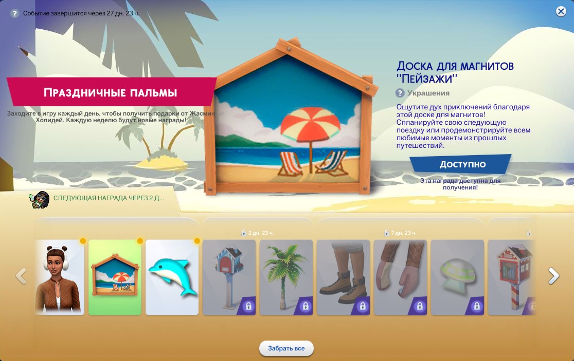 Подробнее: https://www.ea.com/ru/games/the-sims/the-sims-4/news/deck-the-palms-login-event Для всех, у кого есть онлайн-версия игры - лицензия или настроенная пиратка. (Версия из этой раздачи отлично подходит, первые два скриншота сняты на ней.)