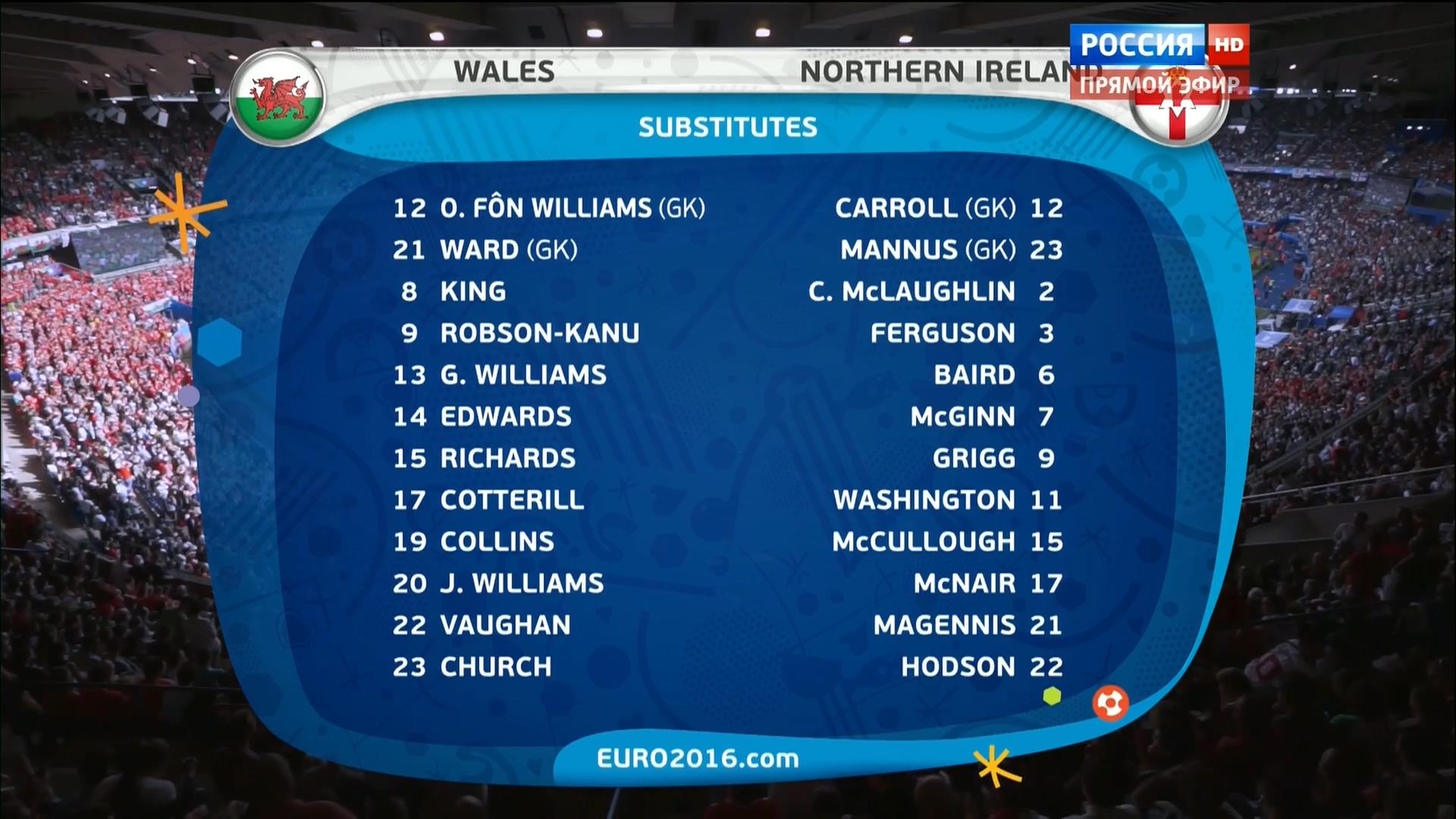 Уэльс - Северная Ирландия Вид спорта: Футбол Участники: Уэльс - Северная Ирландия Язык комментариев: Русский (Владимир Стогниенко) Описание: 25 июня 2016, суббота. 19:00 МСК