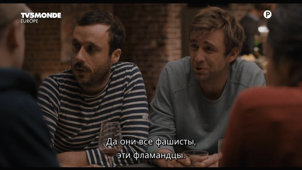 1 00:00:19,560 --> 00:00:21,733 Да они все фашисты, эти фламандцы. 2 00:00:21,733 --> 00:00:23,562 Ладно тебе, не преувеличивай. 3 00:00:23,562 --> 00:00:26,165 Я так не думаю. А ты что скажешь? 4 00:00:26,165 --> 00:00:28,559 Ненавижу всех этих придурков 5 00:00:28,559 --> 00:00:31,968 из бедных районов... -В Брюсселе неплохо, по-моему. 6 00:00:31,968 --> 00:00:35,562 В центре есть красивый квартал с хорошими магазинами. 7 00:00:35,562 --> 00:00:39,011 Я на днях спросила дорогу у мента, а он прошел мимо. 8 00:00:39,011 --> 00:00:41,923 -Не ответил? -Нет, как будто и не видел меня! 9 00:00:41,923 --> 00:00:44,329 Хотя я стояла прямо перед ним. 10 00:00:44,329 --> 00:00:47,642 -Язык у них слишком гортанный. -Ты на нем говоришь? 11 00:00:47,642 --> 00:00:50,453 Во время войны между Фландрией и Валлонией... 12 00:00:50,453 --> 00:00:51,603 Только не это! 13 00:00:51,603 --> 00:00:53,403 Лоран, только не анекдот. 14 00:00:53,403 --> 00:00:56,044 -Анекдот! -Давай, мы слушаем. 15 00:00:56,044 --> 00:00:58,723 Идет война в траншеях. 16 00:00:58,723 --> 00:01:00,605 Она длится уже 10 лет, 17 00:01:00,605 --> 00:01:03,567 поэтому траншеи становятся все глубже и глубже. 18 00:01:03,567 --> 00:01:06,608 Солдаты не могут стрелять, друг друга не видят. 19 00:01:06,608 --> 00:01:10,081 И тут валлоны говорят: "Есть идея. 20 00:01:10,081 --> 00:01:14,161 Фламандцев ведь всех зовут Ян?" "Да". "Давайте крикнем - Ян!