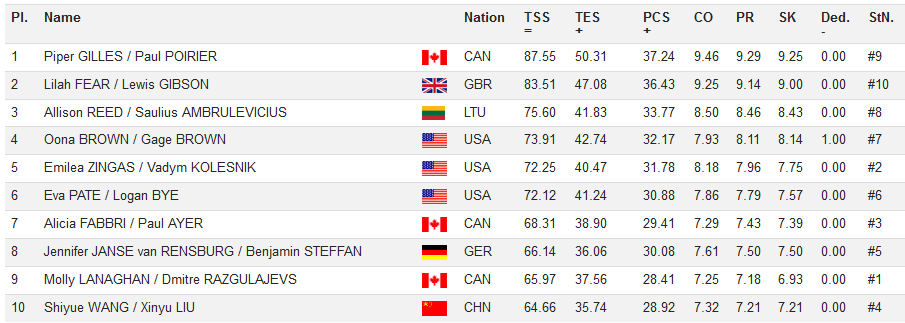 Алисия Фаббри — Пол Айер (Канада), Пайпер Гиллес — Поль Пуарье (Канада), Молли Лэнахэн — Дмитрий Разгуляев (Канада), Ван Шиюэ — Лю Синьюй (Китай), Лайла Фир — Льюис Гибсон (Великобритания), Дженнифер Янсе ван Ренсбург — Беньямин Штеффан (Германия), Эллисон Рид — Саулиус Амбрулевичюс (Литва), Уна Браун — Гэйдж Браун (США), Ева Пэйт — Логан Бай (США), Эмилия Зингас — Вадим Колесник (США).