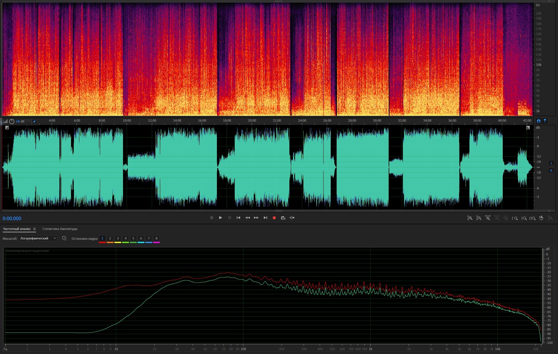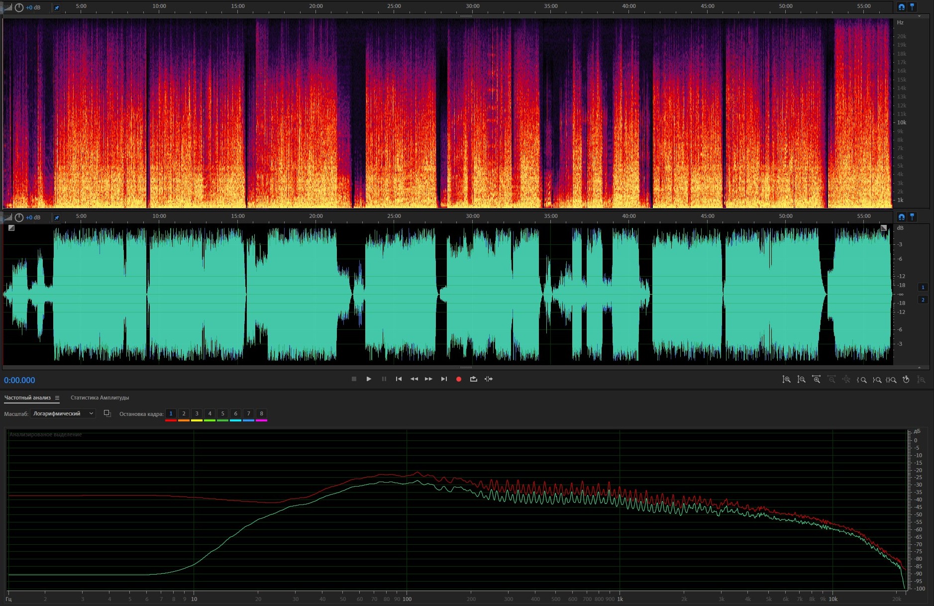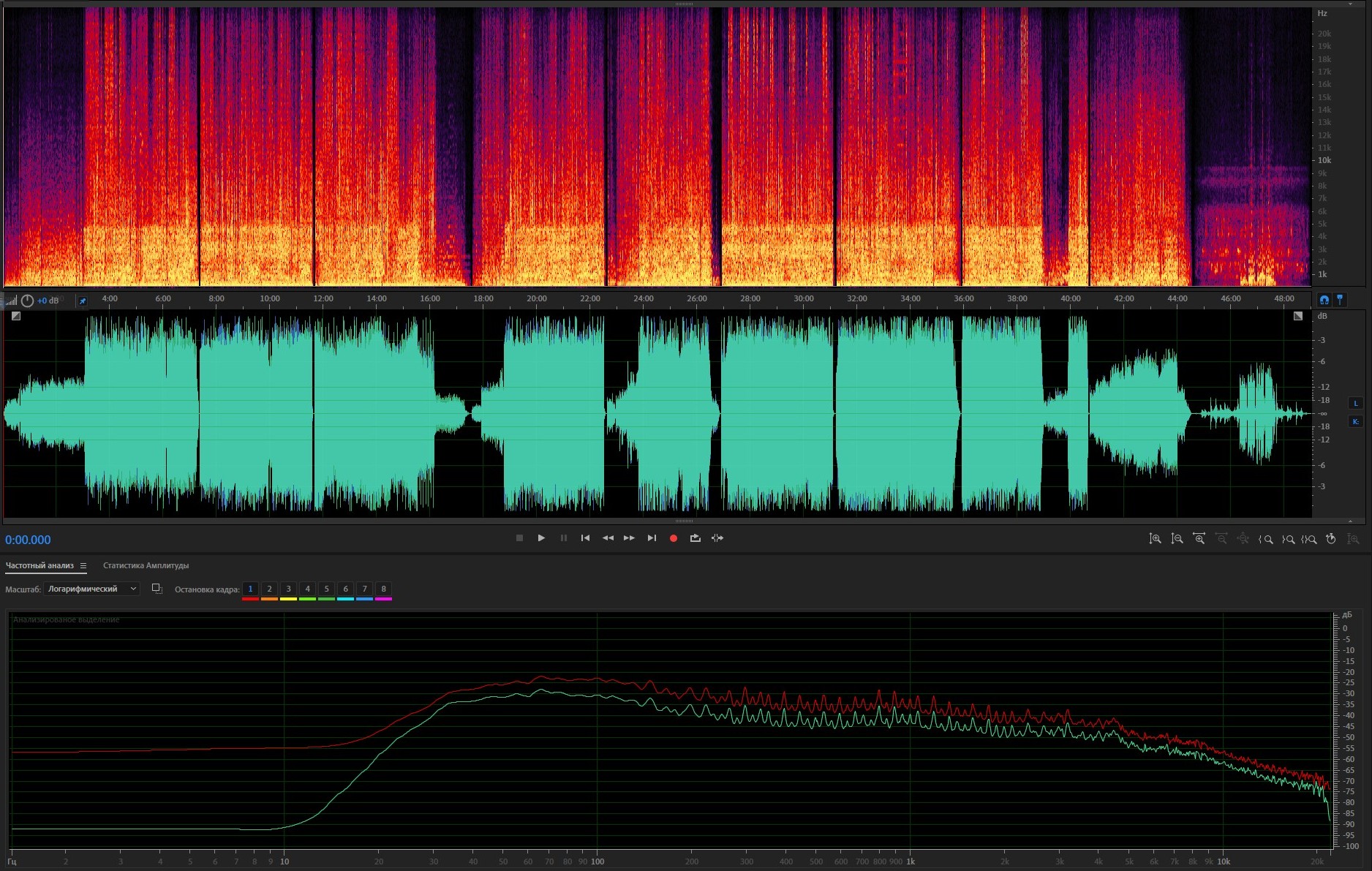 3. Спектр и амплитуда после обработки; АЧХ: красная - оригинал, зеленая - после обработки.